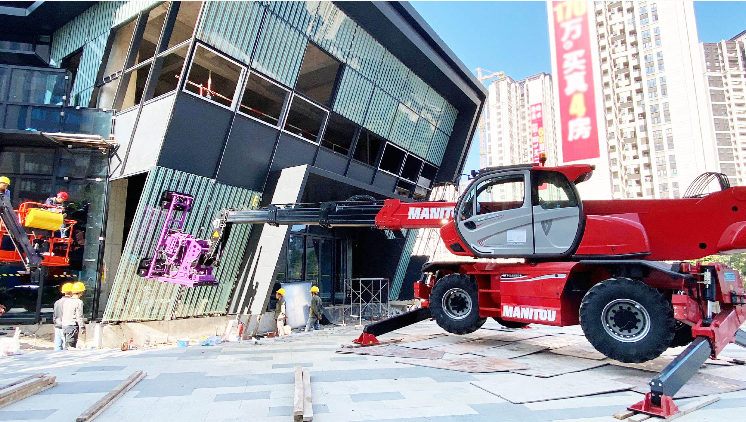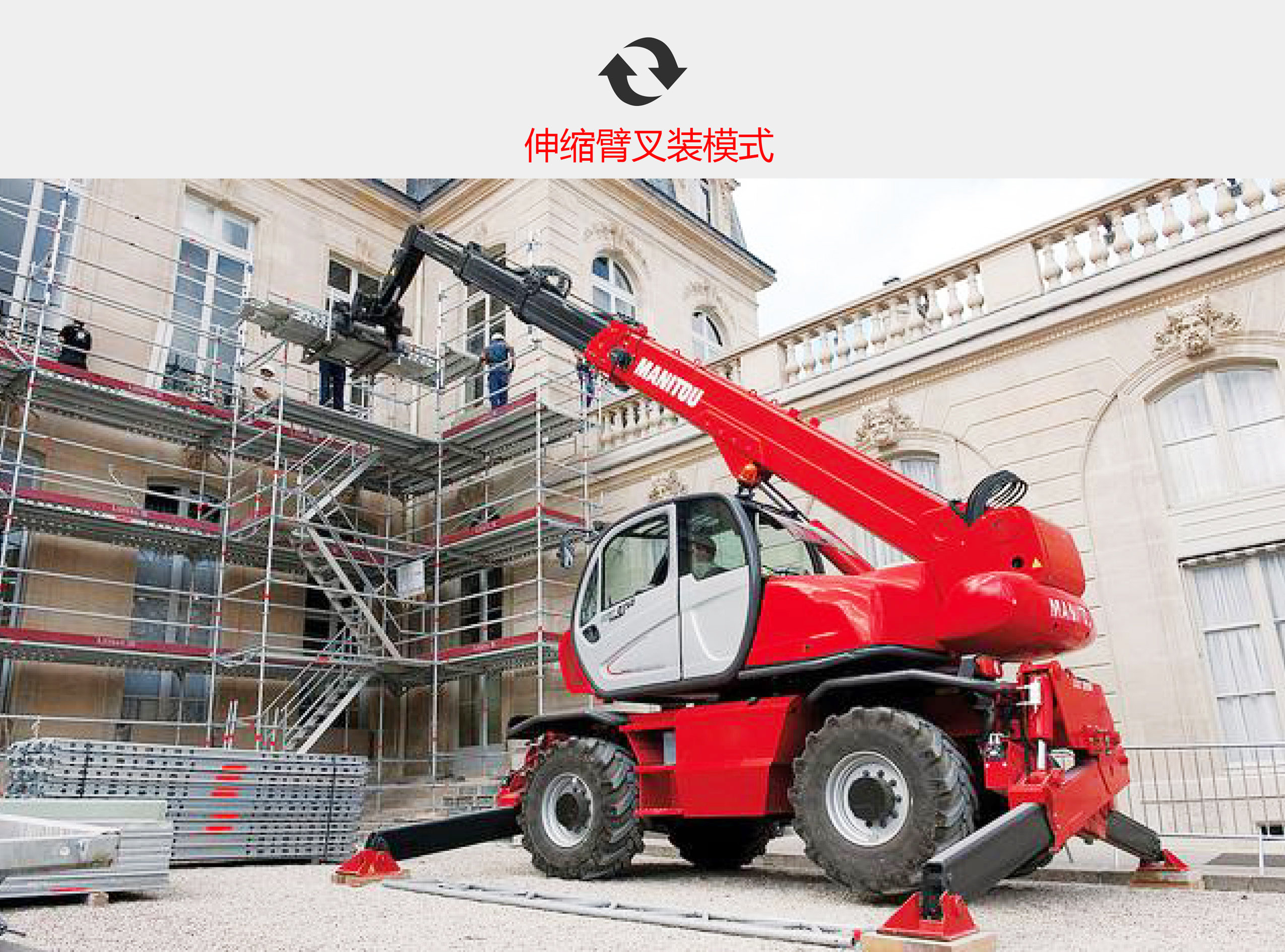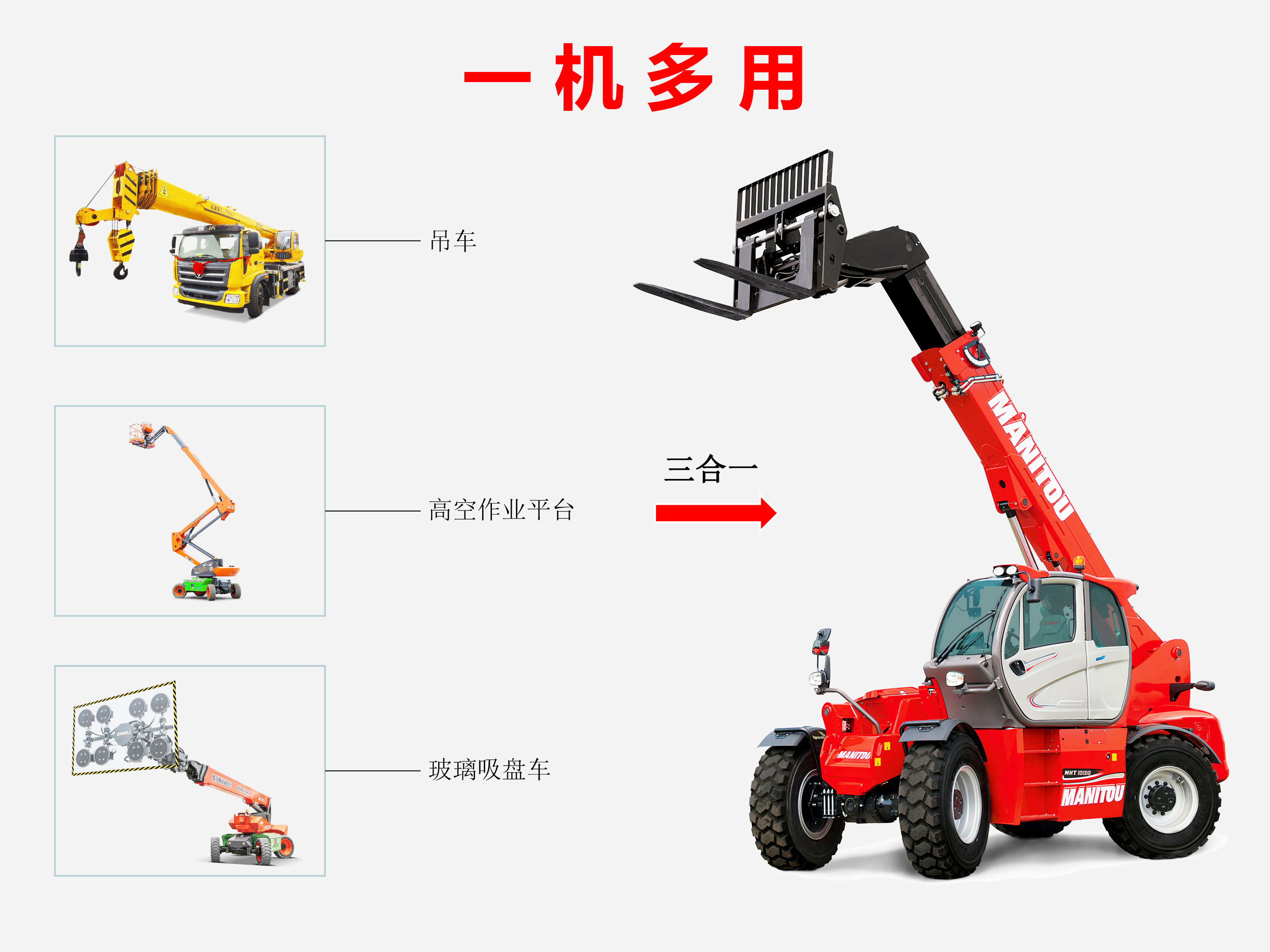 ? 使用一臺(tái)3合1設(shè)備(伸縮臂叉裝車,起重機(jī)和高空作業(yè)平臺(tái))。